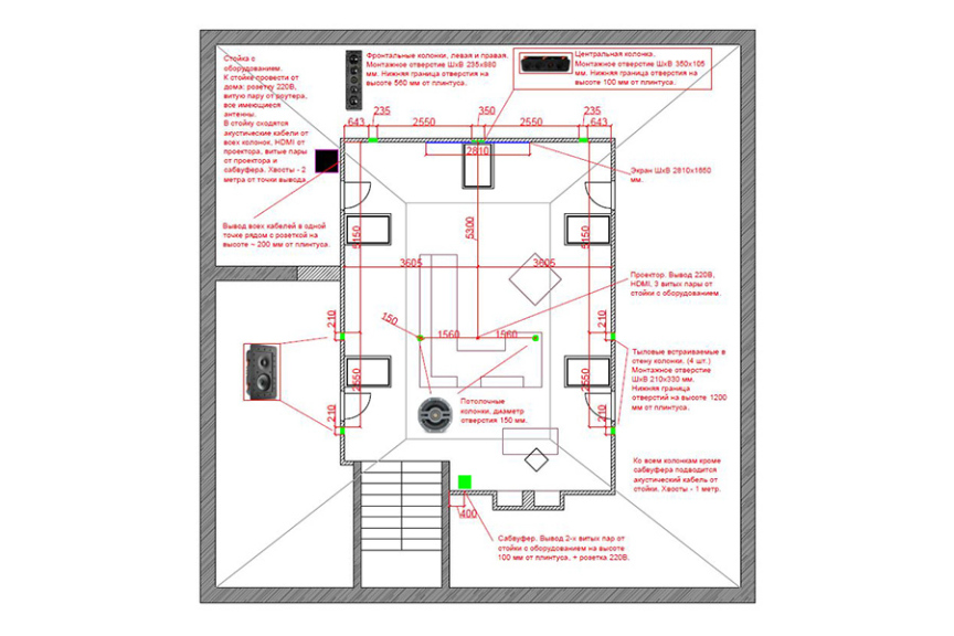 Бесплатное нанесение нашего оборудования на ваши чертежи, со схемой прокладки кабелей. Или создание чертежа помещения с нуля при необходимости. Мы убеждены, что качественная установка домашнего кинотеатра высокого класса без проекта невозможна.